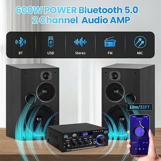 2. HiFi Stereo Amplifier: 2.0 channel digital amplifier can provides 600W P.M.P.O(Peak Music Power Output), with powerful audio processing chip, distortion Rate: ≤0.5%, signal-to-noise ratio: 85db, strong anti-interference ability, shielding power inductance, low noise amplifier,HiFi stereo sound effects, you can experience the effect of immersive