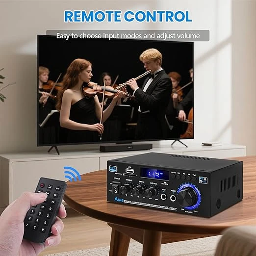 3. Bluetooth 5.0, Easy to Use: This AK45 home audio amplifier built-in Bluetooth 5.0 chip, supports wireless connection between audio devices and amplifiers, lossless sound quality and convenience. Mini power amplifier with remote control for distant audio adjustments, you can switch 6 different equalization effects built-in the player. With US plug for easy to use,great for home theater system use