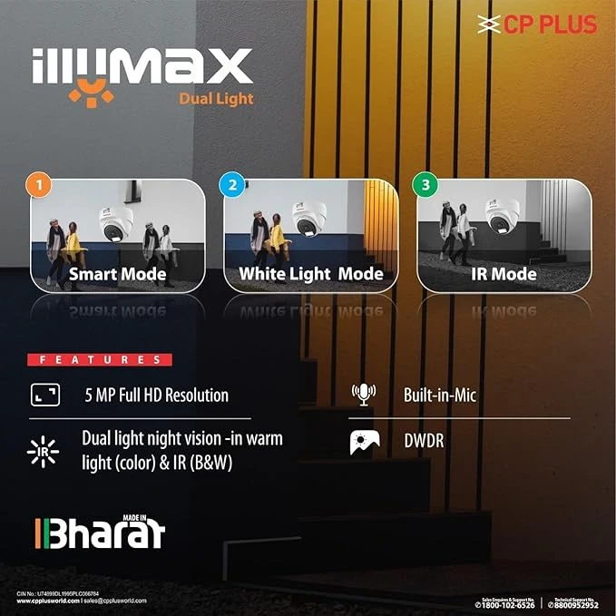 1. CAMERA SPECS: CP PLUS illumax 5MP Dual Light Color Night Vision Audio Camera [Built-in Mic], Dual Light Night Vision -Color & IR (B&W), Motion Detection, Active Deterrence With Instant Alert with AI DVRs, OSD Menu for Sensor Level Adjustment, High quality imaging with 5MP (2880 × 1620) resolution, EXIR- IR Range Up to 30m, Up to 20 m white light distance for bright night imaging, Switchable (TVI/AHD/CVI/CVBS ), D-WDR, 2D-DNR, IP67 Water & Dust Proof, Mode -DNR/DWDR/BLC/HLC/Global.