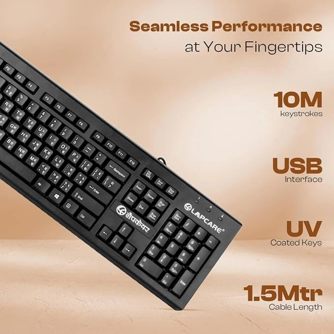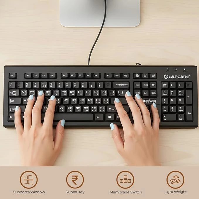 LAPCARE LMK-012 Multilingual USB Keyboard – Hindi English Typing, 104 Silent Keys, 10 Million Keystrokes, 1.5M Cable, Rupee Key, Membrane Switch – for Business & Office Use